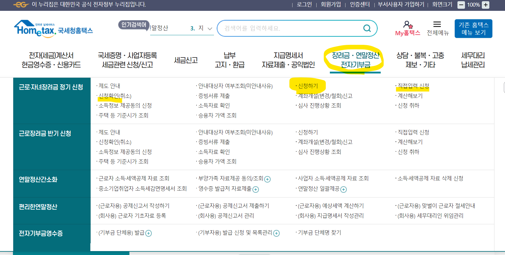 1. 국세청홈택스에 접속 후 "장려금 연말전산 전자기부금"을 선택합니다. 신청하기 클릭 합니다.